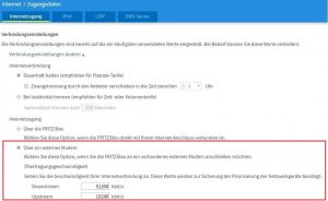 • Bei Nutzung einer FRITZ!Box, klicken Sie im Reiter „Internet“ -> „Zugangsdaten“ -> „Internetzugang“. Im nun geöffneten Menü muss „Über ein externes Modem“ aktiviert und darunter die gebuchte Bandbreite eingetragen sein (siehe Bild).